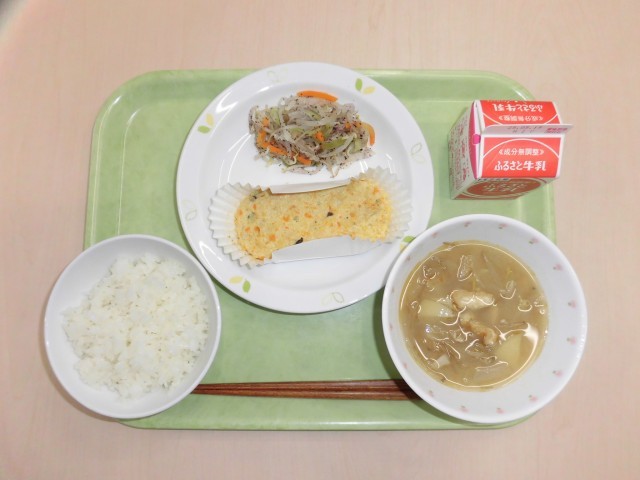 献立は、ごはん、千草焼き、野菜のゆかりかけ、豚肉と野菜のみそ汁、牛乳です。