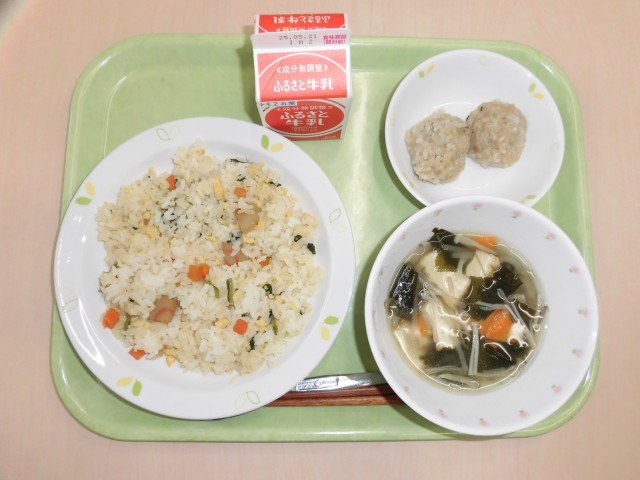 献立は、小松菜とたまごのチャーハン、珍珠丸子(ちんじゅわんず)、わかめスープ、牛乳です。