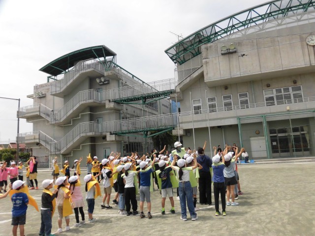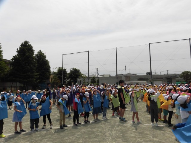クラスごとに図面の線の上に立ち、カラーエプロンを広げます。(中)