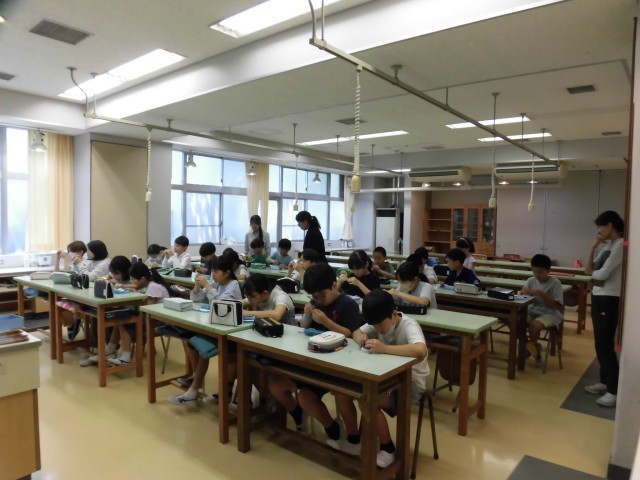 5年生は、初めて裁縫道具を使います。道具の確認や針の扱い方等の学習をした後、針に糸を通してみました。写真は、1分間で何回針に糸を通すことができるか、チャレンジしているところです。みんな真剣です。このクラスの最高記録は26回でした!
