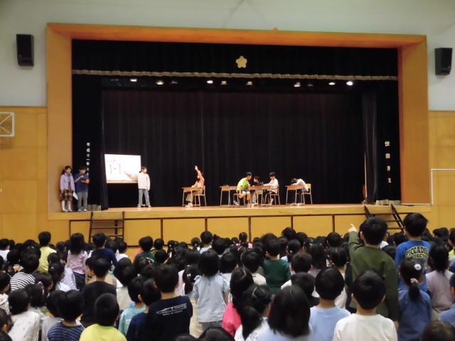 今朝は、集会委員会の「人間間違い探し」がありました。最初の場面(写真左)と次の場面(写真右)の違うところを探します。見つける時間は10秒間です。結構難しかったです。