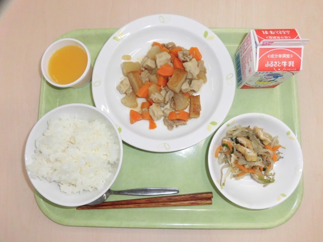 献立は、有機米ごはん、豚肉と大根のうま煮、野菜と油揚げのおひたし、みかんゼリー、牛乳です。