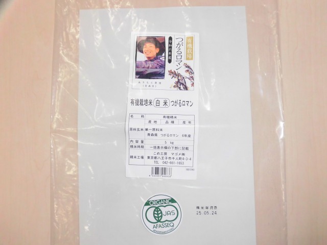 有機米ごはんのお米は「青森県産つがるロマン」です。おいしいです。(中の写真はお米の袋です。)