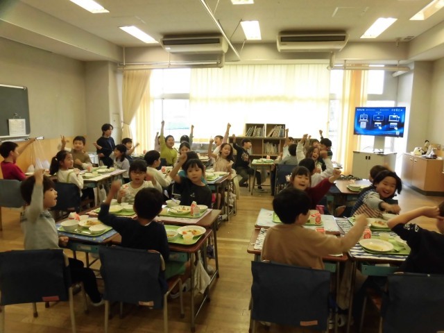 右の写真は、お昼の放送の音楽に合わせて楽しそうに給食を食べている2年生です。