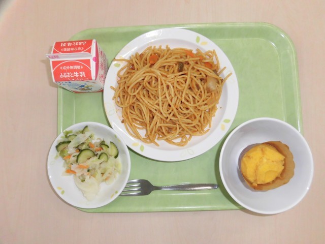 献立は、スパゲッティナポリタン、りんごドレッシングサラダ、キャロットケーキ、牛乳です。