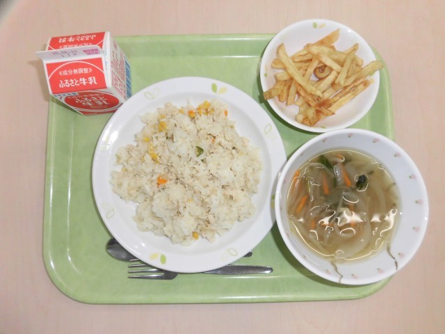 献立は、ナシゴレン、フライドポテト、野菜スープ、牛乳です。