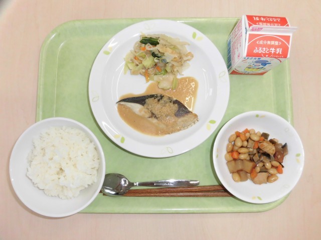 献立は、有機米ごはん、魚のステーキソース、油揚げ入りお浸し、五目豆、牛乳です。