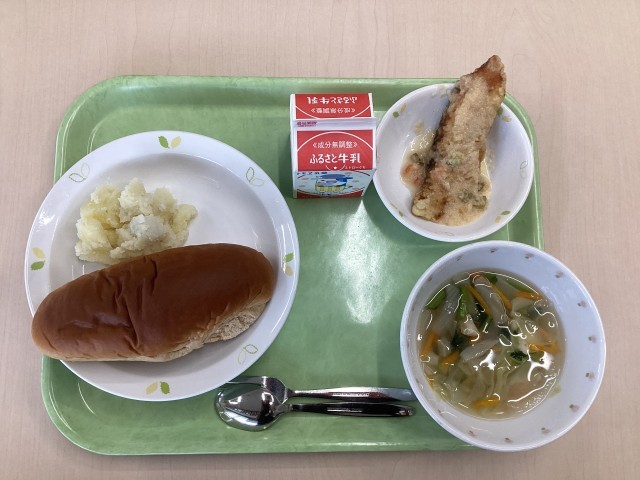 献立は、黒砂糖パン、魚のエスカベージュ、粉ふきいも、鶏と野菜のスープ、牛乳です。