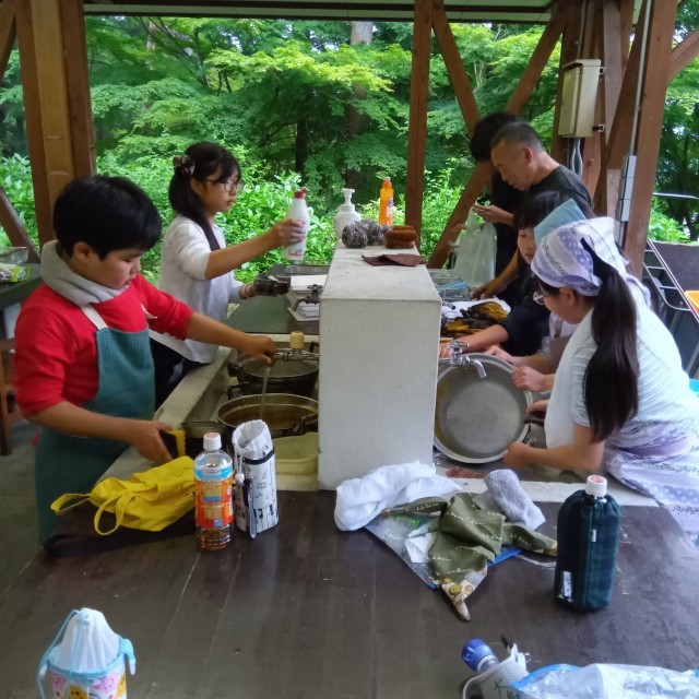 片付けを始めました。飯ごうのごはん粒や、鍋のすすを取るのを頑張っています。