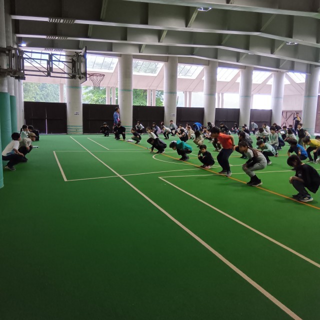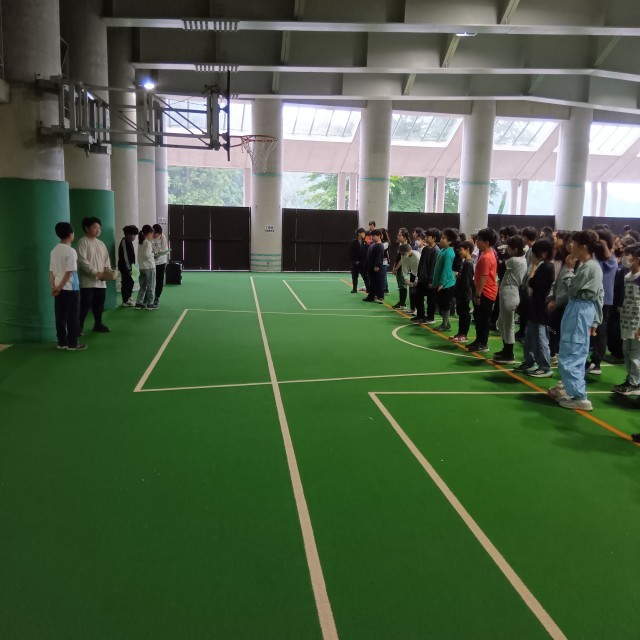 朝会をしました。6時過ぎから小雨が降っていたので、屋根つき広場で行いました。