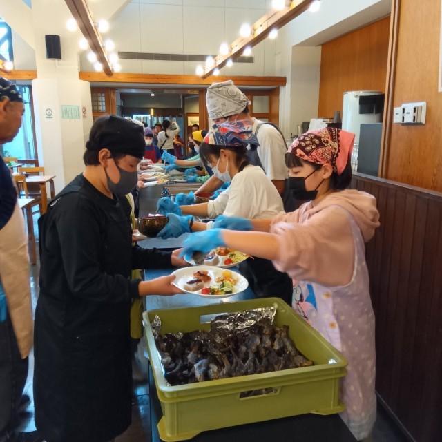 今日の夕食は、みんながつかみ取りしたマスもついているので、豪華です。