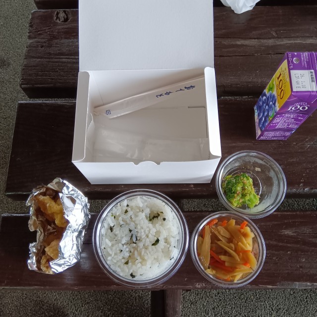 お昼のメニューです。からあげとわかめご飯がおいしいそうです。