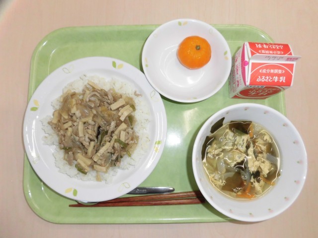 献立は、チンジャオロース丼、卵とわかめのスープ、冷凍みかん、牛乳です。