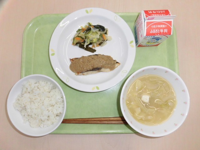 献立は、麦ごはん、魚のごまだれかけ、和風サラダ、みそ汁、牛乳です。