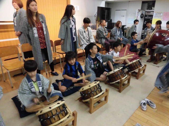 まず、八幡山町会長 島田様より、お囃子の歴史のお話を伺いました。それから、お囃子の演奏を聞き、実際に太鼓をたたいたり、笛にチャレンジしたりしました。