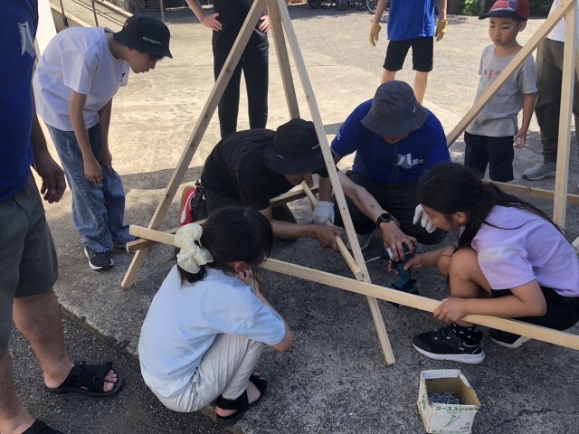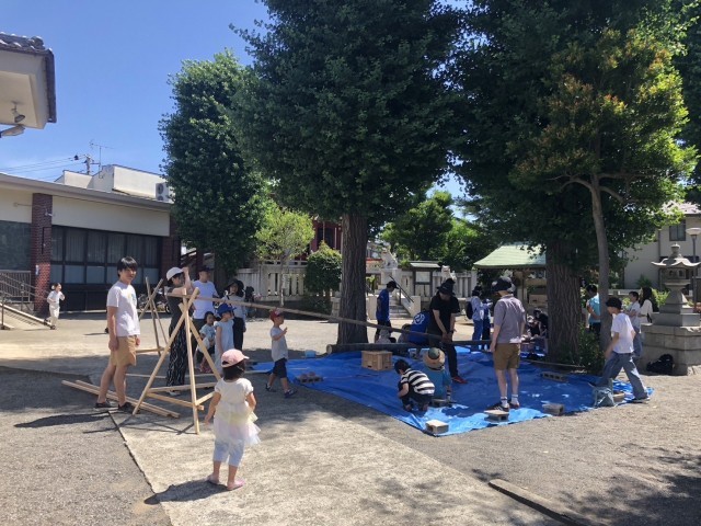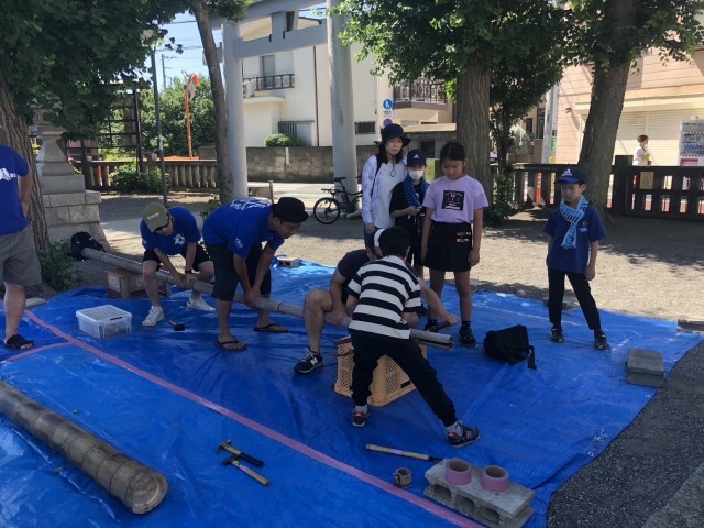 暑い中、おやじの会の皆さんが竹を取ってきてくれました。八幡山八幡社で、竹の節を取る活動を行いました。