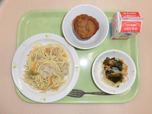 献立は、キャベツとツナのスパゲッティ、もやしとわかめのサラダ、おからマフィン、牛乳です。
