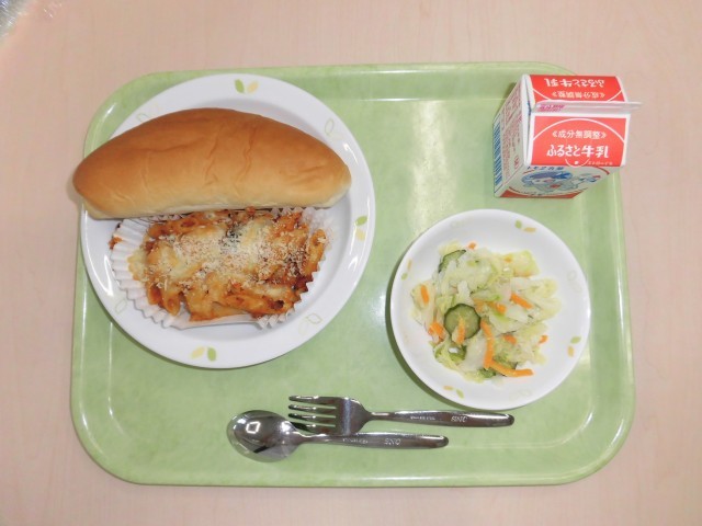 献立は、コッペパン、ラザニア風、キャベツサラダ、牛乳です。