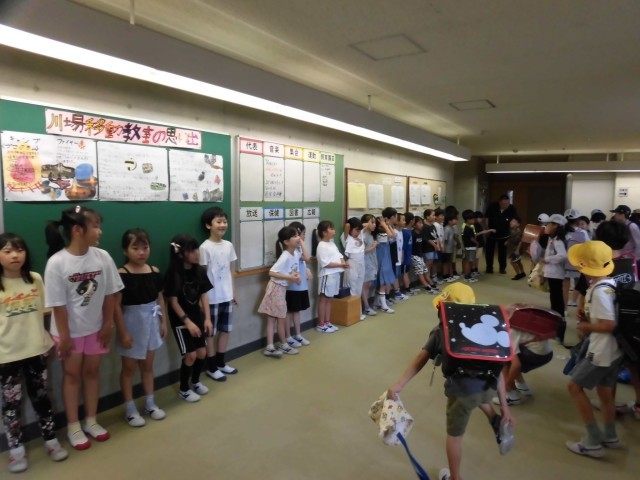 今週は2年生があいさつの担当です。靴箱前でたくさんの子があいさつをしていました。
