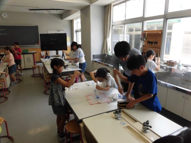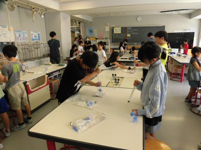前回、空気は押し縮めることができたので、水も同じようにできるのではないかと考えた子もいましたが、実際は「1ミリも縮まない・・・」「押したら水が下からもれてきた!!」と、同じようにはいきませんでした。