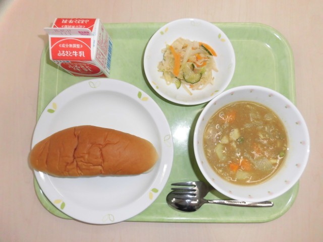 献立は、ミルクパン、カレーシチュー、野菜のイタリアンドレッシングかけ、牛乳です。