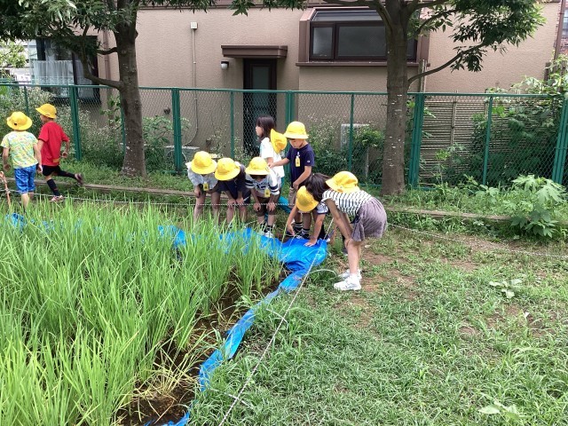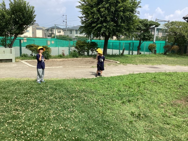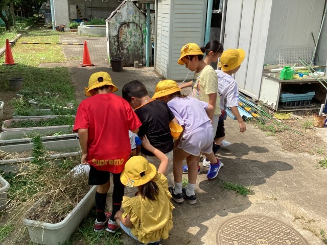 7月8日(火)、本校の生活科園で1年生の子どもたちは夏探しをしました。「見つからないな。」「夏が分からないな。」などと話していたと思いきや、「先生、地面が暑いよ。」「草が元気よく生えている」などと夏を見つけると子どもたちは生き生きしていました。夏をいっぱい感じた1時間でした。
