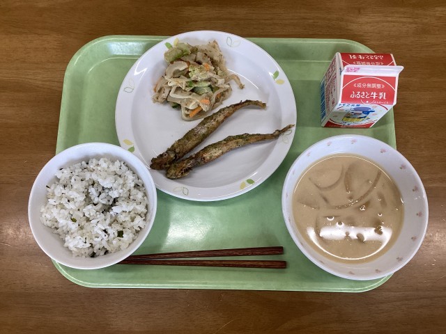 今日の献立は、わかめごはん、ししゃもの磯部揚げ、ちくわと野菜のごま和え、豆乳入りみそ汁と牛乳です。