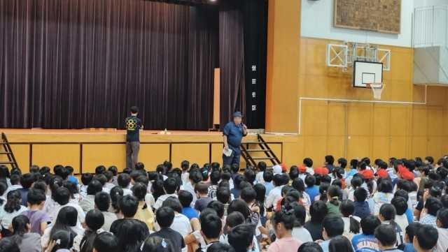 八幡山町会の防犯部長さんから全校児童に、防災についての講話をしていただきました。