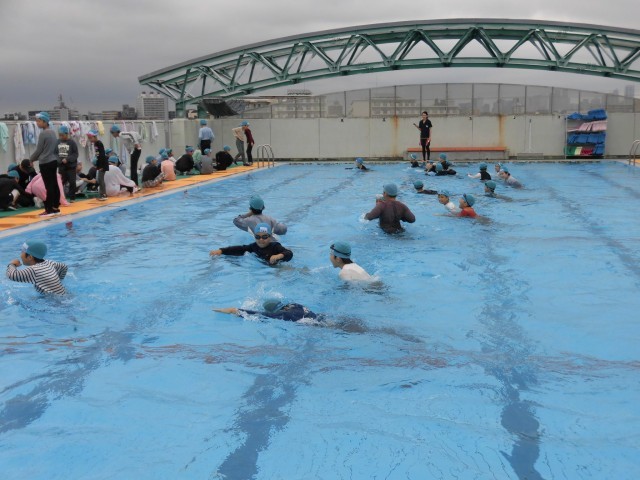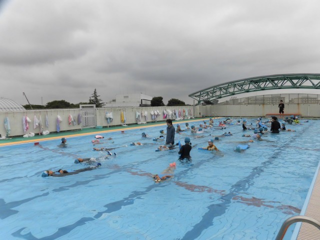 今日5年生と3年生は着衣水泳を行いました。水着の上に長袖・長ズボン、靴を履いて水の中を歩いてみたり、浮いてみたりしました。空のペットボトルやビート板を持って、長く浮く体験もしました。3年生は服を着ると、重くてプールサイドに上がれないと言っている子もいました。一方、5年生は服を着ていると浮きやすいと言っている子もいました。普段と違うことが分かり、よい経験になったのではないかと思います。