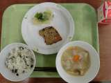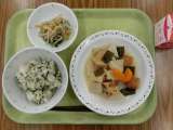 献立は「わかめごはん、魚の七味焼き、かぶのレモンじょうゆかけ、呉汁、牛乳」です。...