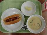 献立は「ホットドッグ、魚のチャウダー、りんご 牛乳」です。 *食材産地**...