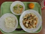 献立は「ごはん、家常豆腐、春雨サラダ、みかん、牛乳」です。 *食材産地**...