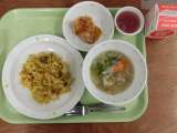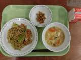献立は「ソース焼きそば、大豆とじゃこの甘辛揚げ、中華風コーンスープ、牛乳」です。...