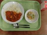 献立は「カレーピラフ、鶏肉のマーマレードソース、野菜スープ、ぶどうゼリー、牛乳」...