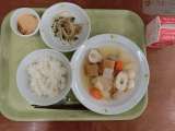 献立は「麦ごはん、洋風おでん、もやしのごま風味、黒糖寒天、牛乳」です。 *...