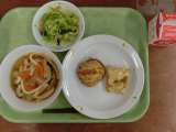 献立は「ちゃんこうどん、てんぷら(さつまいも、いか)、野菜のごま風味、牛乳」です...