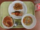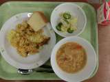 献立は「ぶどうパン、魚のバーベキューソース、スパゲッティソテー、野菜スープ、牛乳...