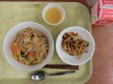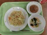 献立は「キャベツとツナのスパゲッティ、わかめサラダ、おからマフィン、牛乳」です。...