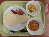 献立は「ナン、キーマカレー、じゃがいもの素揚げ、イタリアンサラダ、牛乳」です。 ...