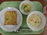 献立は「ガーリックトースト、コーンシチュー、キャベツのハニードレッシングかけ、牛...