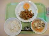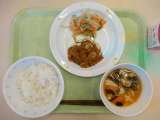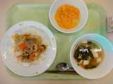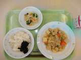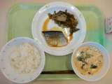 献立は「魚の味噌だれかけ、牛乳、茎ワカメの炒め煮、きのこ入りかきたま汁」です。...