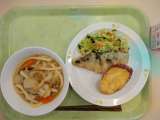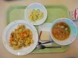 献立は「ぶどうパン、牛乳、魚のバーベキューソース、スパゲッティソテー、野菜スー...