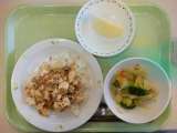 献立は「キムチ丼、牛乳、わかめスープ、フルーツポンチ」です。 キムチは、韓国...
