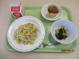 献立は「キャベツとツナのスパゲッティ、牛乳、わかめのサラダ、おから胡麻マフィン...
