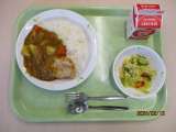 献立は「ごはん、牛乳、野菜カレー、米粉のチキンカツ、イタリアンサラダ」です。今...