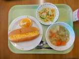 献立は「卵チーズトースト、牛乳、ポトフ、コーン入りフレンチサラダ、スイートスプ...