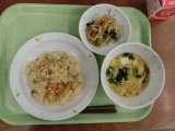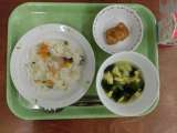 献立は「三色ピラフ、鶏肉のカレー焼き、卵と野菜のスープ、牛乳」です。 *食...