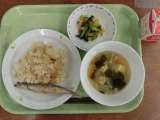 献立は「たけのこごはん、ししゃものからあげ、豆腐汁、野菜のおかかかけ、牛乳」です...