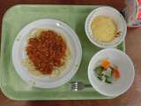 献立は「スパゲッティミートソース、野菜のピクルス風、パインケーキ、牛乳」です。 ...