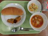 献立は「コッペパン、魚のフライ、レンズ豆入りミネストローネ、マカロニサラダ、牛乳...
